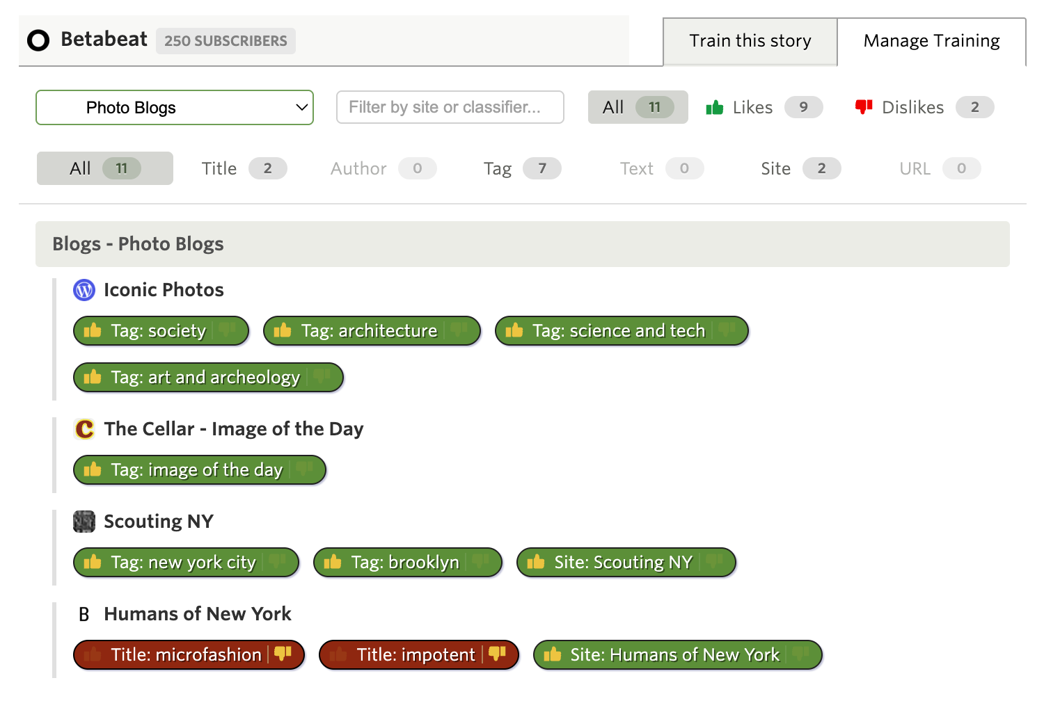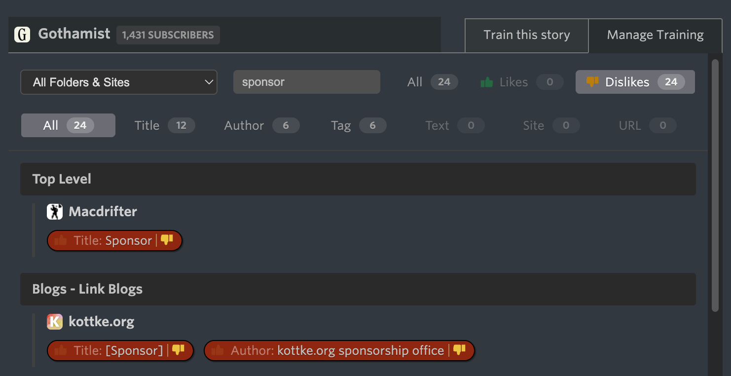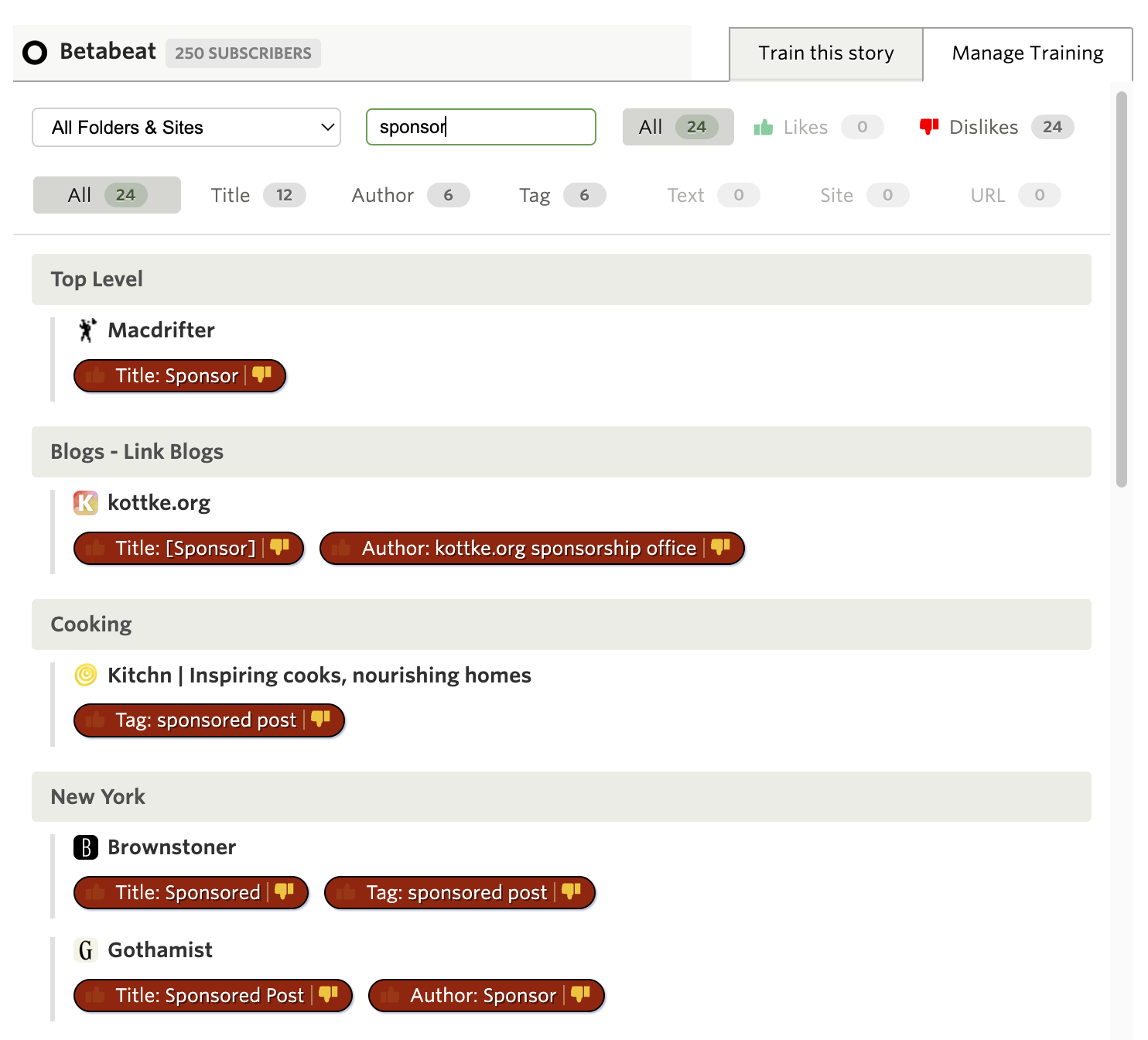 The Manage Training tab shows only what you’ve already trained. Every thumbs up and thumbs down you’ve ever given, organized by folder just like your feed list. Each feed shows its trained classifiers as pills you can click to toggle.